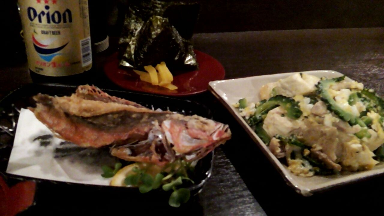 そういえば、最近すっかりソウルバーについてレビューしなくなってしまった…。ということで、沖縄に仕事で出かけた序でに発見したソウルバーについてレビュー。前段、一人沖縄・那覇で何しようと思ってたところ、一応は国際通りがベタなわけです。そんでもって、ベタながらお土産をあれこれ買うために恒例のお店をあれこれ。ゴーヤ関連、アグー肉味噌関連、島らっきょう…いや〜、沖縄は食べ物必見だらけ。そんでもって、見つけたのがソウルバー。でも腹減ったし、ってことで見つけたのが"あんま一家"なる提灯が出てる居酒屋。ちょっと一人で入るのはイジイジしたんだけど。。で、奥を通されたんだけど若い子が多すぎて、一人でイジイジしているのがもどかしくて、カウンターを選ばせていただきました。んでもって、食べたいものを厳選して注文。ゴーヤーチャンプル、グルクンの唐揚、油みそおにぎり、オリオン中瓶ビール(ビールはたまになら飲めるんだけど、出来たらハイボールが良かったんだけど、でも他の日本酒や泡盛とかは若干高い感じがしたので…)。でも、どれも旨かった。これでお会計2000円程。ナイス!