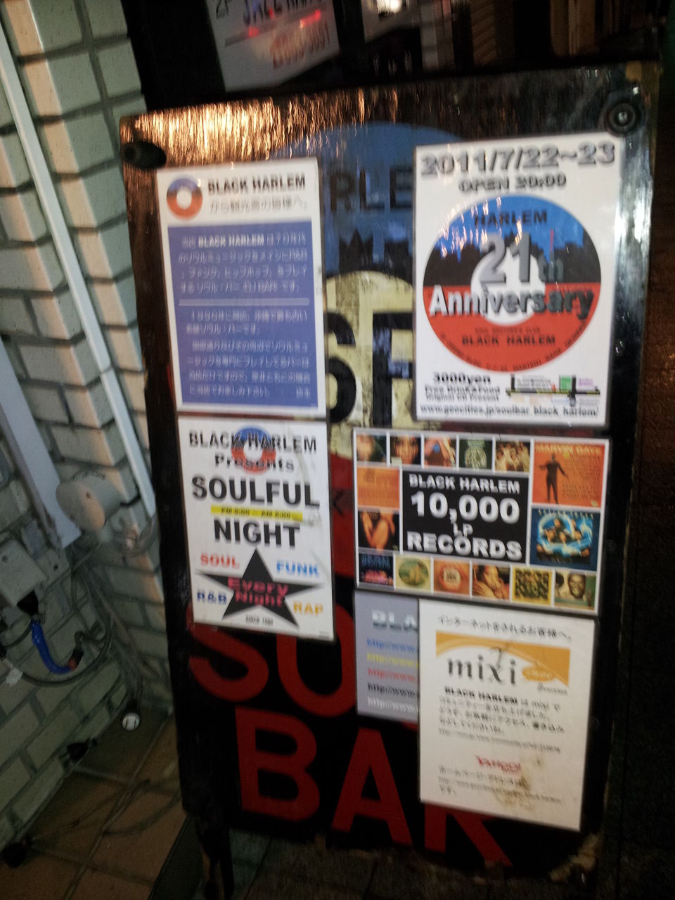 さてさて、居酒屋を出て、軽くのお酒の状態で、ソウルバー""Harlem"に潜入。ちょっとダークな感じがしたのは、金曜の夜のまだ早い時間だったからかな。一応、何かイベントやってたら入りづらいかなぁとか、まだ使い始めのスマホを使って調べたんですけどね。そうそう、スマホ買ったってこの間レビューしましたけど、有り得ないくらい電池の減りが早くて、ビックリです。ある時、フル充電の状態で寝たのに、起きてた電池が半分になってた。はい、脱線しました。。取り直し。まずは中へ入ると、カウンターと後ろにソファ(?)席。ソファ席の裏手にはポスター、The Ovations とかだったなぁ。で、カウンターに座り、メニュー。ハイボール、ハーパーを注文。で、お通しでナッツ等が出てきたけど、居酒屋の味を残しておきたくて手をつけず(爆)。まず驚いたのはかなり音が良い事。左手にあるでっかいスピーカーが本当に存在感を成してて、それはそれは驚嘆。この中で好きな音を聴きまくったらヤバイと思います。
