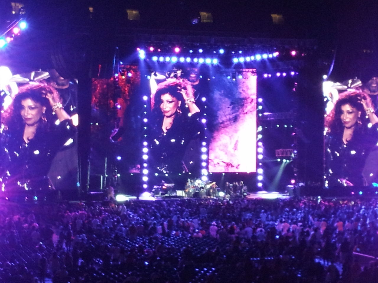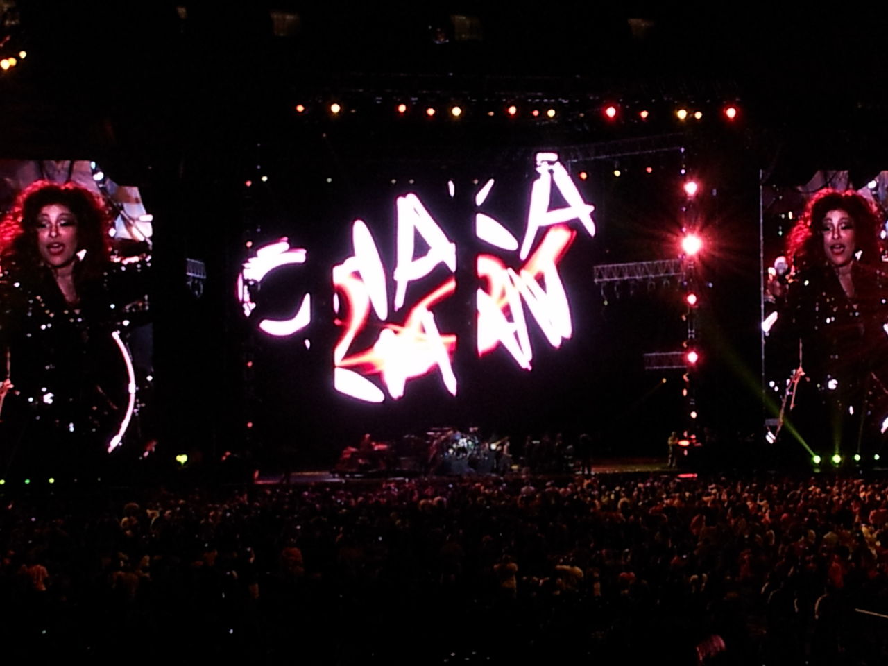 25:00 Main Stage : Chaka Khanなんとも夜中の1時にトリがドームでスタートって、年越しイベントとでも思わないと日本では考えにくいかも。「Feel For You」でライヴスタート。スクリーンも何気に効果的に使っている他、見事にダイエットに成功して機敏になったチャカを観てるだけでも相当楽しい!歌声も痩せずにむしろ健在。初めて見たチャカに深夜ながら感動。アレサで大分押したこともあり、以降のプログラムは結構に巻きに見えましたが、なんかチャカもそれを意識していたっぽいです。ほんとガラガラの会場になってしまい「みんな疲れてると思うけど」という気遣い・・・。いい人だ。でも、歌は相当に攻撃的。「I'm Every Woman」「Tell Me Something」「My Funny Valentine」・・・次々と名曲が続きます。高音バシバシとアタック!特筆すべくはメアリーが前日に歌った2曲。まずはRufus 時代の「Sweet Thing」を会場と一体となって歌う姿は、メアリーを思い出しただけでなく、チャカのエネルギー・人となりも感じました。そして最後の「Ain't Nobody」はメアリーがオープニングとして歌った曲。これがフェス最後になったことで、なんかメアリーとの強力な関係を感じました(でも互いにアレサを称えているところも嬉しいですが)。