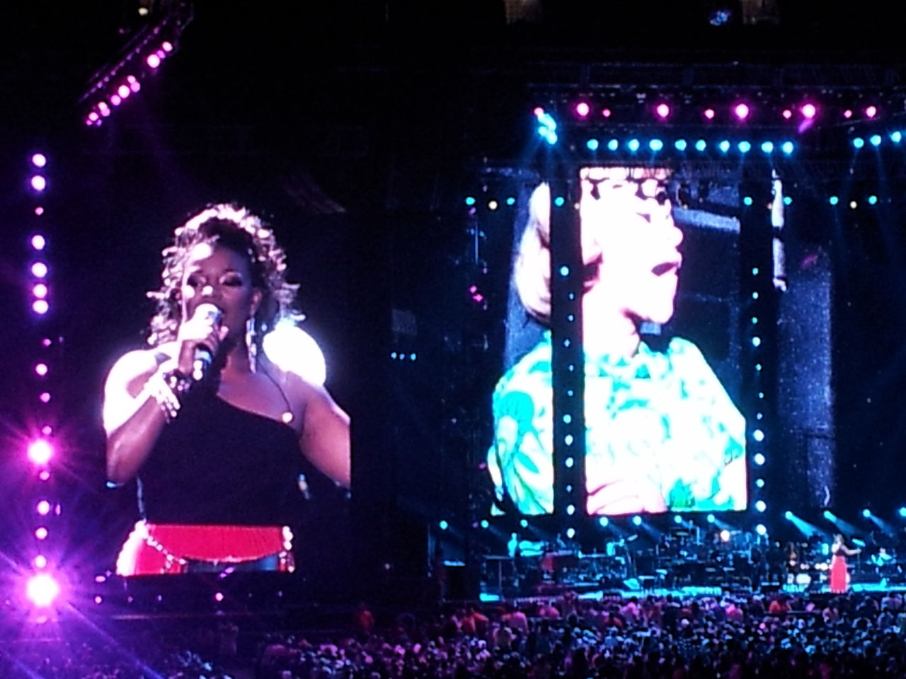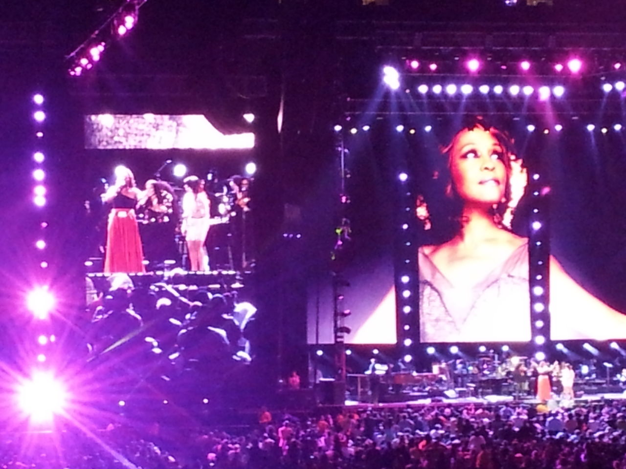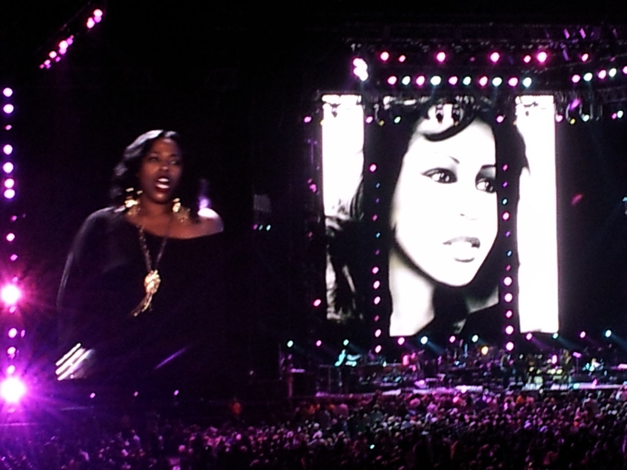 ※ここで2つ目のネタを。スクリーンには何かしたらの形でホイットニーの写真がフォトフレームのように写るのですが、なんとその中に何故かチャカ・カーン単独の写真が!それも限られた枚数を繰り返しているものだから、何度もチャカ・カーンの写真が出てくるし。多分、アメリカの方々は、チャカをアレサかホイットニーと思い、あんま疑問も抱かずスルーだったかも、どよめきさえ無かったし。。嗚呼いい加減・・・。