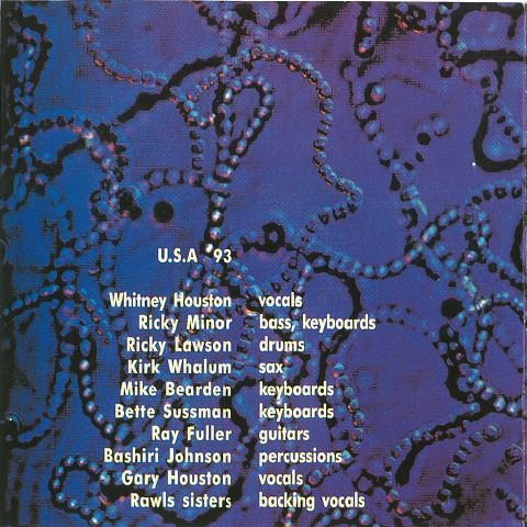 ホイットニー・ヒューストンのブートなのかな、ライヴCD。1990年代前半はMariah Carey なんかも含めてこういったライヴ盤が続々リリースされていたけど、今回は見たことも無いジャケット(ネットでも見つからず)だったんで、で格安だったんでお試し買いしてみました。U.S.A.1993 ともブックレットにも記載あるので、その当時のライヴだとは思いますがリリース時期不明。でもThe Bodyguard からの曲は未収録。あくまでもI'm Your Baby Tonight までのライヴからなのでしょうか、それとも演ったけど未収録って感じなのか 詳細不明です。一応、ミュージシャンクレジットだけは載ってて、ホイさんの弟だったり、サックスにはKirk Whalum なんかも参加してて、厚みある布陣!ドイツのBest Buy Records ってところのリリースですが、アメリカのベストバイとは無関係なのかな?!1. Saving All My Love For You